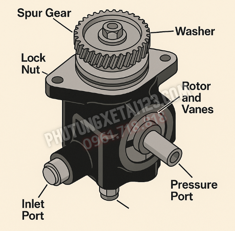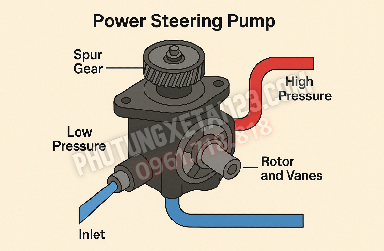 Tạo dòng dầu áp cao từ két/rộng chứa (inlet) tới đường áp (pressure) để hỗ trợ chuyển động của cơ cấu lái.