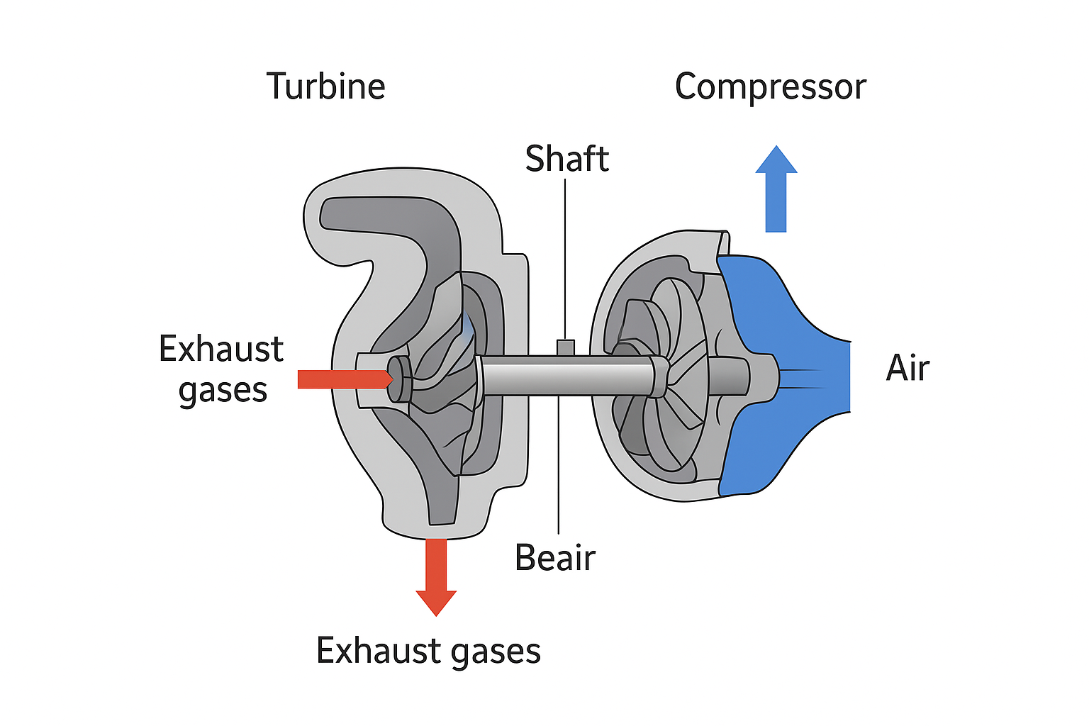 Ổ trục & bạc đạn (bearing system): Giúp trục turbo quay tốc độ rất cao (lên tới hàng chục nghìn vòng/phút) ổn định và giảm ma sát.